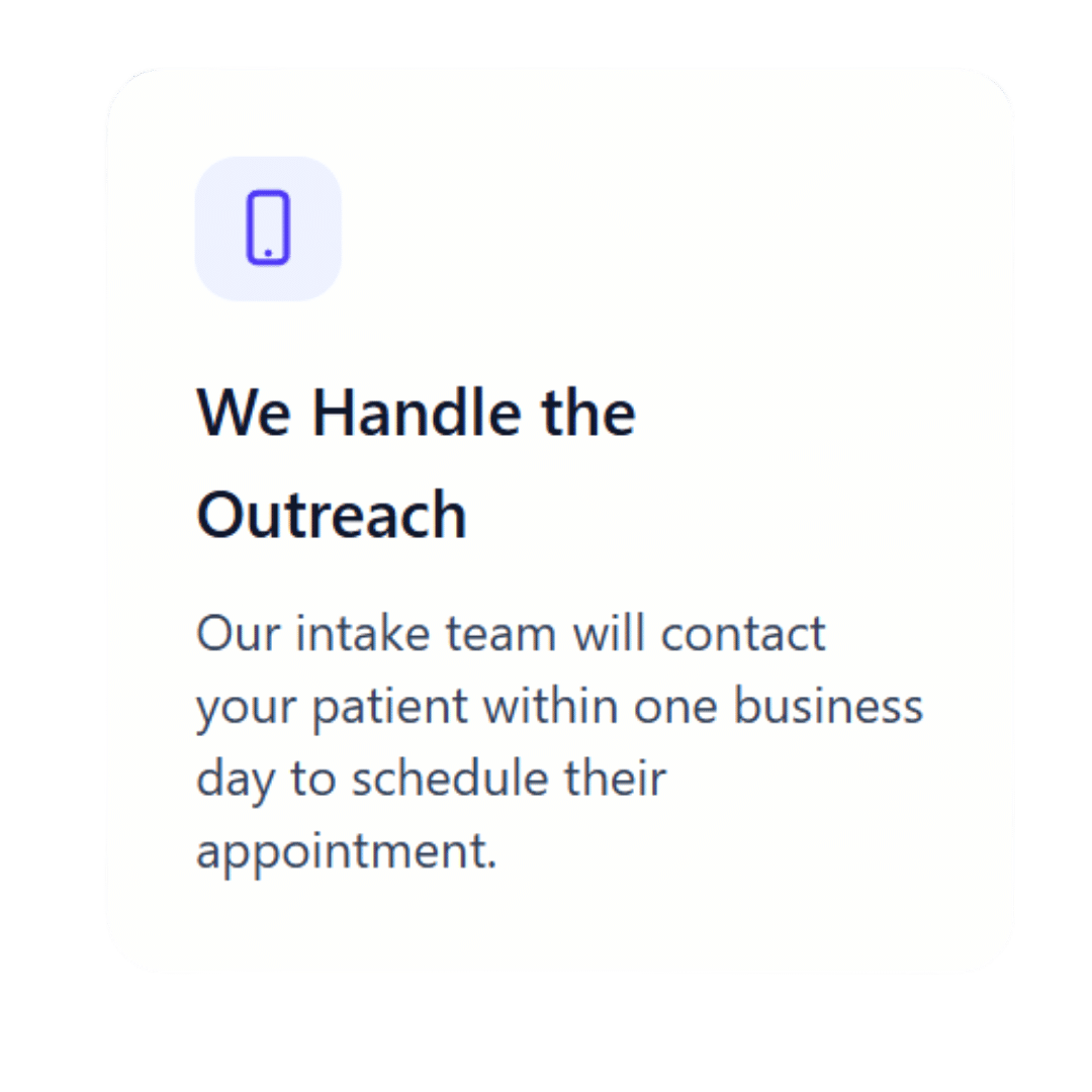 Upon submission, our intake team will contact the patient within 24 business hours to schedule their appointment.